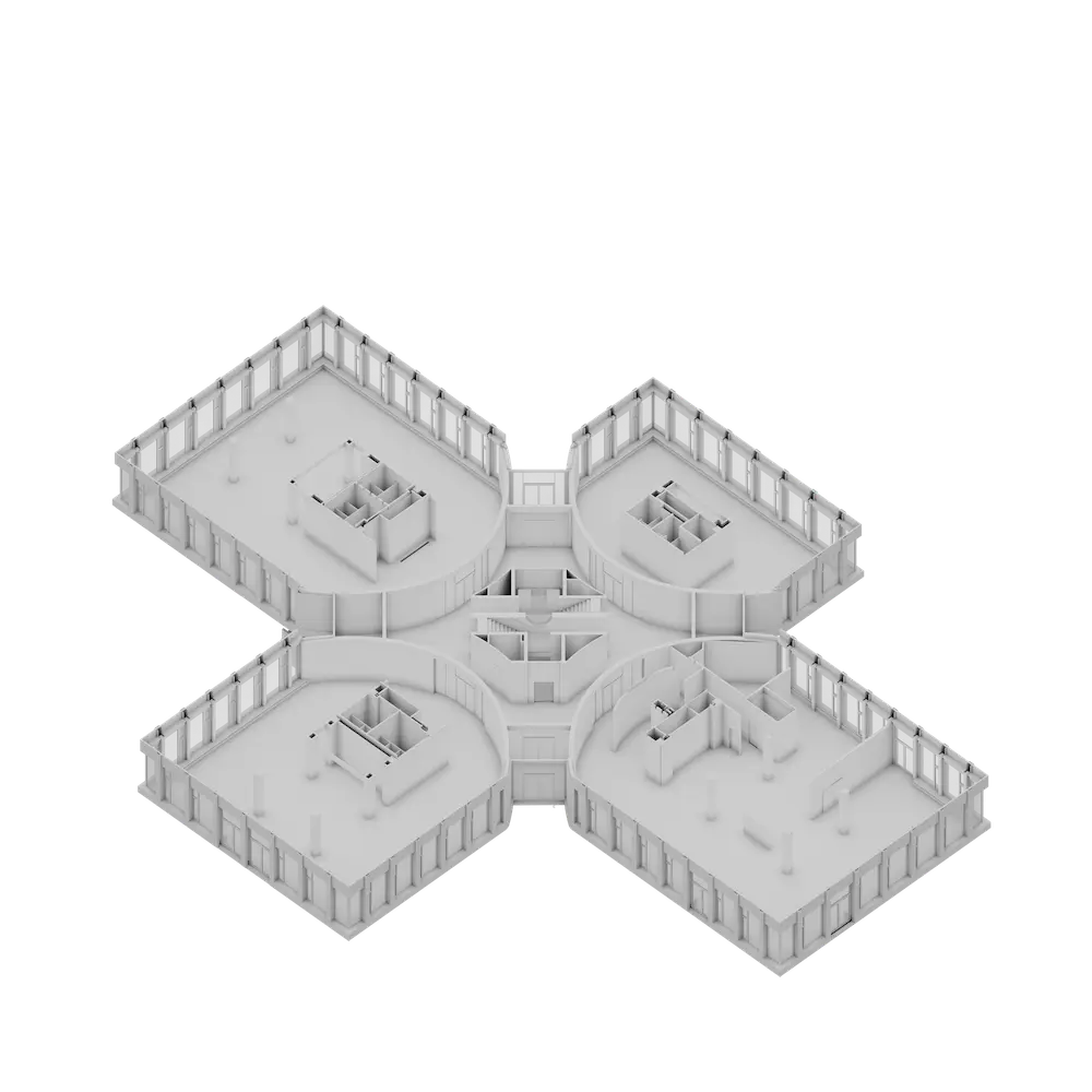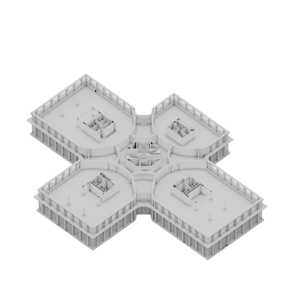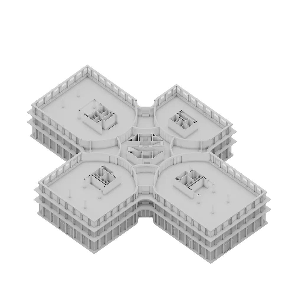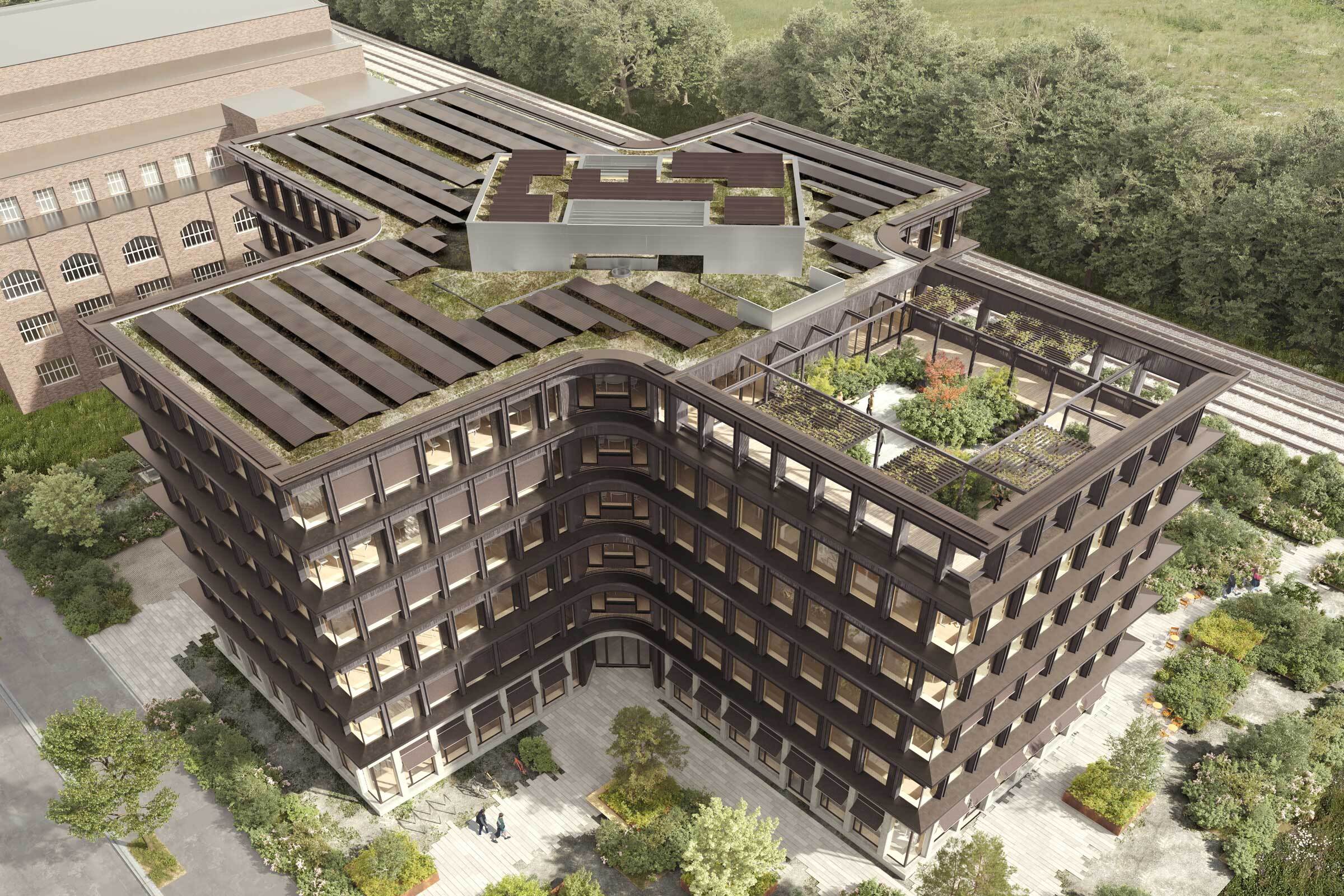 Konsequent setzt der über vier Achsen frei begehbare Cradle-to-cradle-Bau auf wiederverwertbare Materialien und energieeffiziente Low-Tech-Lösungen, etwa für die komfortable Raumkonditionierung des Gebäudes, das in seinen vier unterschiedlich dimensionierten Flügeln passenden Platz für verschiedenste Unternehmen bietet. Ohne Abstriche in der Raumqualität: Der intelligent konzipierte Grundriss bietet jedem Mieter dieselbe lichte und inspirierende Arbeitsatmosphäre.