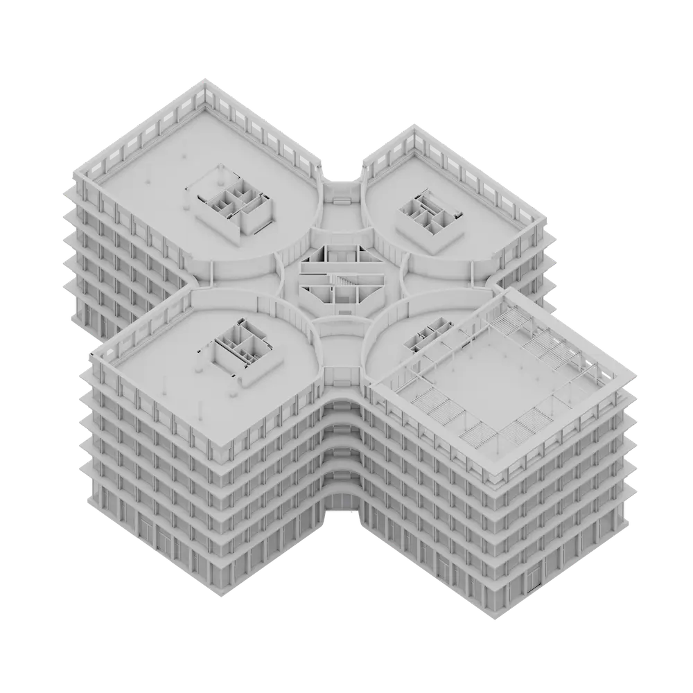 Hier integriert sich der Nexus als neuer Fokus in ein lebendiges Büroquartier und verleiht ihm ein anziehendes und attraktives Gesicht.