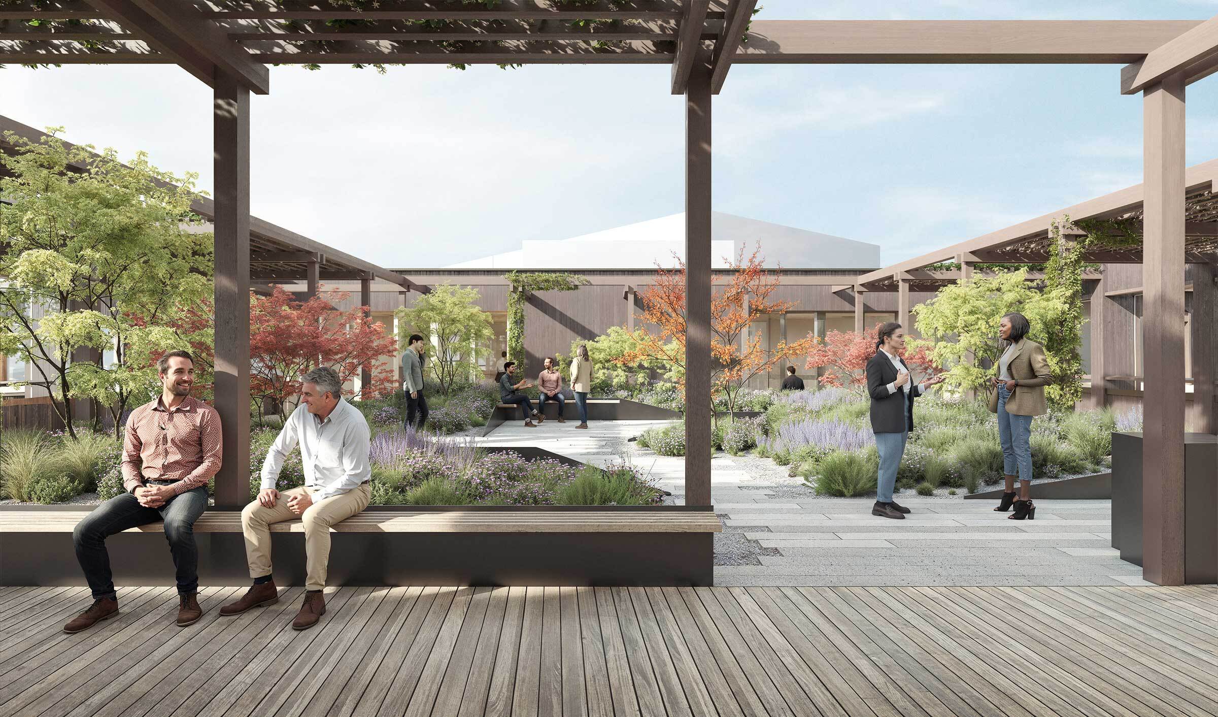 Dachgarten, Grünflächen und Terrassen erweitern den Arbeitsraum nach draussen – und schaffen Freiraum für Körper und Geist.